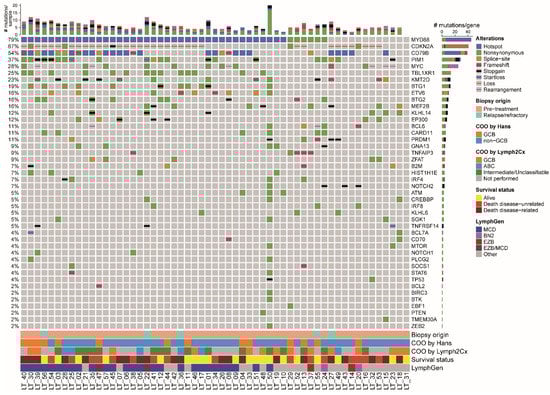 With the identified variants in the cohort, the LymphGen 2.0 online tool (https://llmpp.nih.gov/lymphgen/lymphgendataportal.php, accessed on 13 September 2022) was implemented to ascertain the clusters as defined by Schmitz et al. [13,14]. For this analysis, the variant coding was changed to correlate with the variant coding of LymphGen 2.0, together with an annotation file for the included samples with or without information regarding the BCL2 or BCL6 rearrangements. Due to the lack of copy number alteration data, the A53 cluster could not be assigned within this cohort and the targeted nature of the sequencing method resulted in a reduction of the reliability and capability of LymphGen 2.0.