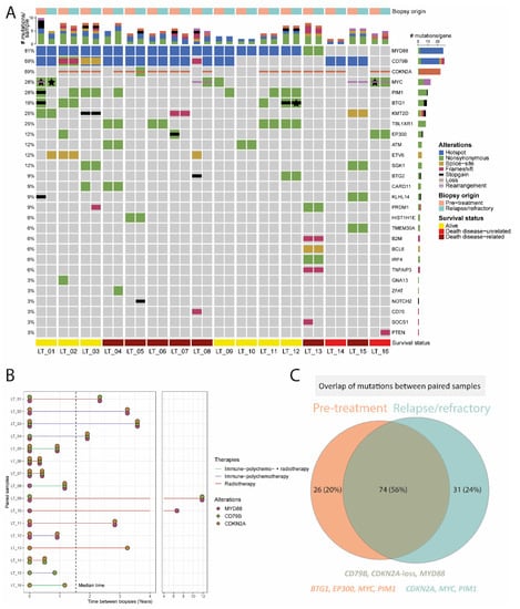 Overall, in all of the 16 patients with paired analysis, at least one of the main driver alterations (MYD88/CD79B/CDKN2A) was genetically stable between primary and relapsed disease.
