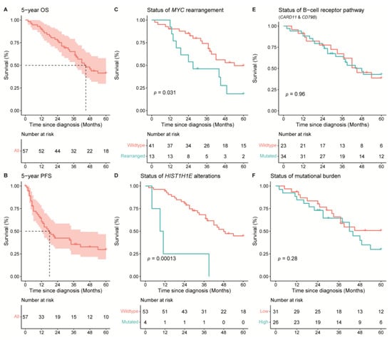 Given the small patient cohort, only a descriptive survival analysis was performed (Figure 4). The median PFS (17 months; Figure 4B) and median OS (44 months; Figure 4A) of our cohort correspond with other studies [8]. In addition, the presence of an MYC rearrangement was statistically significantly associated with an inferior survival (Log rank; p = 0.032; Figure 4C), as was previously reported by our group [9]. Despite other previous reports, the presence of MYD88 L265P, mutations in the BCR pathway genes (i.e., CD79A/B or CARD11; Figure 4E), and loss of CDKN2A were not associated with an inferior survival [6,7,8]. Accordingly, there was no difference in survival for patients with double expressor status of MYC and BCL2, nor for patients with either a low or high mutational burden (less or equal than six mutations compared with more than six mutations, respectively; Figure 4F).