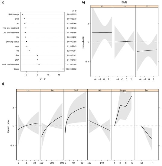 (a) Individual contribution to the model fit from each factor in the full Cox regression model, as tested by the Wald test. (b) Hazard ratios of BMI change for different categories of initial BMI. No significant differences were seen. A hazard ratio of 1 indicates no change from baseline. (c) Hazard ratios for the examined factors in the adjusted Cox proportional hazards model relative to the median value for each factor. For CRP there was a significant correlation between high CRP counts and increased risk of recurrence, while for Trc, Hb, and Lkc the correlation was not significant.