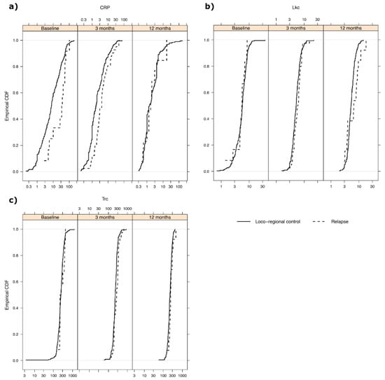 Empirical cumulative distribution functions for the three examined prognostic blood markers. (a) CRP was elevated in the recurrence group, defined as recurrence occurring before the next follow-up. CRP elevation in this group was evident at pre-treatment and at 7 weeks and 3 months after the start of treatment. (b) Lkc counts did not differ between recurrence and loco-regional control groups at any time point. (c) Trc counts did not differ between recurrence and loco-regional control groups at any time point.