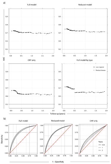 (a) Full model: AUC for Cox proportional hazards model over time for all variables. The AUC value (the area under the ROC curve) is an estimate of the predictive power of the model, where high AUC indicates low false positive and/or false negative rates and AUC = 0.5 is random chance. The AUC showed a clear peak at 0–6 months. Reduced model: AUC over time for a reduced model only using the significant factors (Trc, CRP, pretreatment BMI, and stage). The AUC was not appreciably different from the full model. CRP only: AUC over time for only CRP. It is evident that CRP alone was a worse predictor than the full model. Full model by type: The full model divided by recurrence type. The model was most predictive of residual disease, followed by loco-regional recurrence and general relapse. (b) ROC curves for the models in a). The ROC curves are calculated at 3 months, 1 year and 2 years of follow-up time.