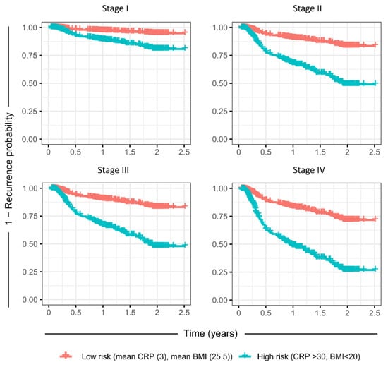 To investigate the ability of this model to stratify high and low-risk populations, a reduced Cox regression model with only the important variables from the full model was used, as determined by Boruta variable selection (Trc, CRP, pre-treatment BMI, and clinical stage, details in Figure S1). The time-varying AUC for the reduced Cox model was not significantly different from the full model (Figure 3c). This model was used to predict the rates of recurrence for the mean population (mean CRP, mean pre-treatment BMI, mean Trc, as well as the mean of the other variables), as well as a high-risk group (CRP > 90th percentile at any time, initial BMI < 20, but mean for the other variables), for each of the clinical stages at diagnosis (Figure 4). For clinical stages II-IV, the high-risk population had a greater than 50% probability of recurrence over a 24-month period post-treatment, while the mean population had less than ~25% probability of recurrence. Since stage was such a significant factor, an attempt was made to perform subgroup analysis using the reduced Cox model. However, the recurrence count was too low in stages I-III to yield informative data (Figure S2). For further model validation, the correlation to the clinically important parameters treatment type or HNSCC site were included in the Boruta variable selection, but they were not significantly more important than the random shadow variables in this dataset.
