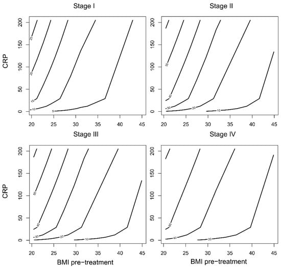 Risk estimation charts. The dataset was simultaneously partitioned by deciles of initial BMI and CRP, yielding 100 cells. In each cell the risk of recurrence over 2 person-years was calculated from the reduced Cox regression model hazard rates, for each of the stages at diagnosis. The contours delineate the risk of recurrence depending on the initial BMI and CRP measured at any timepoint, in percent.