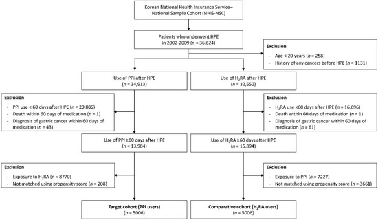 Flow diagram of study subject selection. n, number; H2RA, histamine-2 receptor antagonist; PPI, proton pump inhibitor; HPE, Helicobacter pylori eradication.