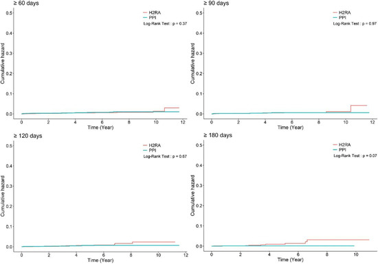 Cumulative hazard plot of gastric cancer development according to the duration of medication. H2RA, histamine-2 receptor antagonist; PPI, proton pump inhibitor.