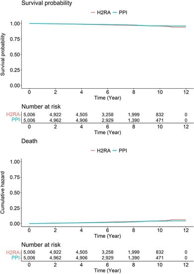 In the context of the mortality in the enrolled subjects, there were no data in the previous studies [9,10]. During the median follow-up of 6.56 years (7.16 year for H2RA group, interquartile range: 5.15–9.21 years; 6.49 years for PPI group, 5.05–8.16 years), there was no significant difference in the mortality between PPI and H2RA user groups (p-value: 0.08) (Figure 3).