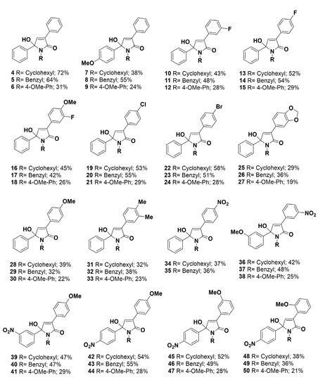 2.2. General Procedure for the Synthesis of 5-hydroxy-3,5-diaryl-1,5-dihydro-2H-pyrrol-2-ones (4–50)