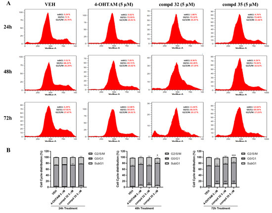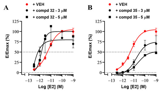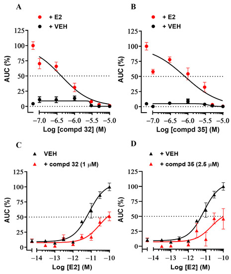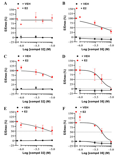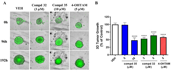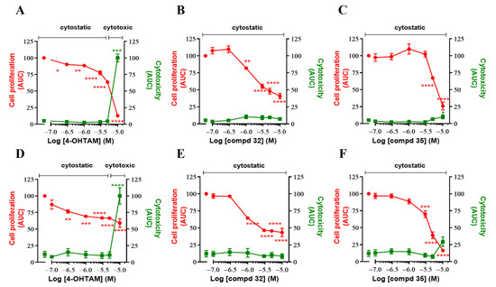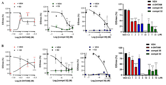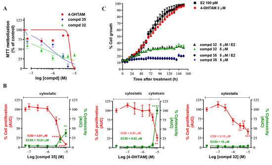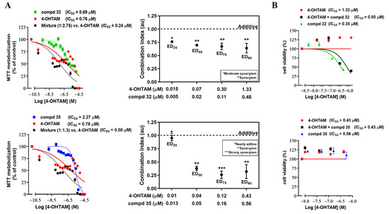Another historically posed challenge linked to the clinical use of 4-OHTAM and other SERMs is the generation of endocrine resistance mainly due to the use of high doses or prolonged treatments [7,65]. In this sense, drug combination may allow the reaching of synergistic pharmacological effects that reduce drug toxicity, resistance and/or increase drug efficacy [43,67]. Hence, to determine whether compounds 32 and/or 35 enhance the antitumoral effects of 4-OHTAM in ER+ BC cells, dose-response synergistic assays combining each compound with 4-OHTAM were performed (Figure 15A). For this purpose, MCF-7 cells were incubated (72 h) with a broad range of compound 32 or compound 35 and 4-OHTAM doses, maintaining a constant ratio combination design [compound 32:4-OHTAM (1:2.75)] and [compound 35:4-OHTAM (1:1.3)]. Interestingly, we observed that both combinations potentiated the inhibitory effects induced by 4-OHTAM on MCF-7 cell viability (from 3 to 10-fold) compared to 4-OHTAM alone (Figure 15A). Accordingly, isobologram and Chou-Talalay analyses of the combination index (CI) [43] showed that combinations of compound 32 (CI for ED25 = 0.762 ± 0.02; CI for ED50 = 0.696 ± 0.01; CI for ED75 = 0.6725 ± 0.06; CI for ED90 = 0.6395 ± 0.09) or compound 35 (CI for ED50 = 0.38 ± 0.04; CI for ED75 = 0.26 ± 0.07; CI for ED90 = 0.32 ± 0.13) with 4-OHTAM acted synergistically in promoting antitumoral effects (Figure 15A); these compound combinations were also studied in non-malignant MCF-10A breast cells (Figure 15B). Interestingly, data showed that the compound 32/4-OHTAM combination affected MCF-10A cell viability to the same extent as compound 32 alone, while this effect was not observed for the compound 35/4-OHTAM combination (Figure 15B). Therefore, the combinatorial evaluation showed that compound 35 could potentiate the antitumoral effects of 4-OHTAM which might enhance its efficacy on ER+ BC cells, thus entailing a very relevant clinical advance.