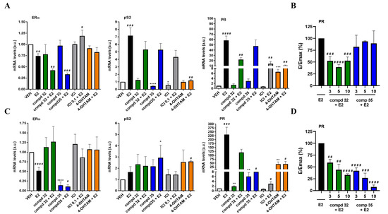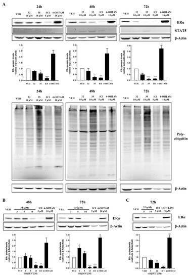 To confirm previous data, the effects of compound 35 on ERα protein expression were also explored in T47D E2-deprived BC cells by using confocal microscopy (Supplementary Figure S4). As expected, E2 caused maximal translocation of ERα in cell nuclei after 30 min. In contrast, compound 32 showed no effects, whereas compound 35 significantly decreased ERα protein levels both in nuclei and cytoplasmic compartments. Interestingly, compound 35, in the absence as well as in the presence of E2, decreased ERα mRNA levels in ER+ BC cells (Figure 9A). In contrast to the mechanism of 4-OHTAM, both protein polyubiquitination and loss of ERα contribute to the antiestrogenic mechanism of compound 35 in ER+ BC cells; these results, together with the low affinity to ERα revealed in the binding assays, lead to hypothesize that proteins involved in the regulation of proteasomal degradation could be potential targets of compound 35. However, if protein polyubiquitination induced by compound 35 contributes to ERα protein turnover through proteasome activation still deserves further research. Full, uncropped immunoblot images are shown in Supplementary Figure S5.
