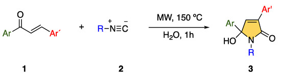 - Adib, M.; Mahdavi, M.; Noghani, M.A.; Bijanzadeh, H.R. Reaction between Isocyanides and Chalcones: An Efficient Solvent-Free Synthesis of 5-Hydroxy-3,5-Diaryl-1,5-Dihydro-2H-Pyrrol-2-Ones. Tetrahedron Lett. 2007, 48, 8056–8059. [Google Scholar] [CrossRef]