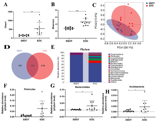 Figure 1. The microbial composition of EBOT and EOC tissues is distinct. (A) The Chao1 index. (B) The Shannon index. (C) PCoA of the weighted UniFrac distance demonstrated that the EBOT and EOC tissues showed two distinct clusters. (D) Venn map representation of OTUs. (E) Microbial composition in epithelial ovarian tumours at the phylum level. The relative abundance of (F) Firmicutes, (G) Bacteroidetes, and (H) Acidobacteria were analysed. Data are presented as means ± SD; * p < 0.05, ** p < 0.01, *** p < 0.001.
