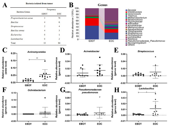Figure 2. Isolation of intratumour microbiota and identification of key strains. (A) Table showing the culture isolated bacteria genera in EBOT and EOC. (B) Microbial composition in epithelial ovarian tumours at the order and genus level. The relative abundance of (C) Actinomycetales, (D) Acinetobacter, (E) Streptococcus, (F) Ochrobacterium, (G) Pseudomonadaceae pseudomonas, and (H) Lactobacillus were analysed. Data are presented as means ± SD; * p < 0.05, ** p < 0.01.