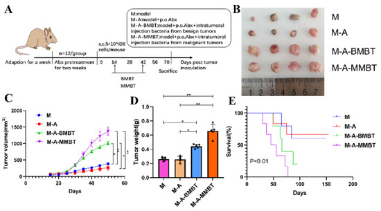 Figure 3. Injecting intratumourally with mixed bacteria from EOC significantly promoted tumour growth and reduced tumour model survival compared to mixed bacteria from EBOT. (A) Scheme of animal experiments. (B) Images of tumours in different treatment groups for 70 days. (C) Changes in tumour volume over time in different treatment groups. (D) Final tumour weights in different treatment groups. (E) Kaplan–Meier survival curves of mouse EOC models in different treatment groups. Data are presented as means ± SD. Two-way repeated measures ANOVA, both with Tukey’s test for multiple comparisons, (BD), respectively, and log-rank test were performed for survival data (E); * p < 0.05, ** p < 0.01.