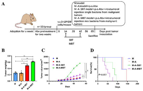 In order to evaluate the influence of endogenous mixed bacteria on the mouse EOC model, 40 mice were casually divided into four groups and treated as follows: (1) M group (n = 10): EOC model; (2) M-A group (n = 10): mixed antibiotics (metronidazole 1 g, neomycin 1 g, ampicillin 1 g, vancomycin 0.5 g) dissolved in 1 L of water for free drinking of mice were administered 2 weeks before tumour inoculation; (3) M-A-BMBT group (n = 10): mixed antibiotics were administered 2 weeks before tumour inoculation and intratumoural injection of 4 × 104 CFU mixed bacteria from EBOT; (4) M-A-MMBT group (n = 10): mixed antibiotics were administered 2 weeks before tumour inoculation and 4 × 104 CFU mixed bacteria from EOC was injected intratumourally. All treatments were given 2 weeks after tumour inoculation, twice a week for 4 weeks. The weight of the mice was recorded with a weight scale and the size of tumours were measured using callipers twice per week. At day 70, four mice of each group were euthanised and their tumours were removed and stored at −80 °C. The remaining mice were used to assess growth curves of tumours and survival. Tumour volume = length × width2 × 0.5 (repeat three times).