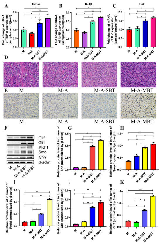 To determine whether the tumour-promoting effect of the P. acnes strain is associated with tumour inflammation, the proinflammatory cytokines expressions were examined. As shown in Figure 5A–C, the mRNA levels of several proinflammatory cytokines increased significantly after treatment with the P. acnes strain on day 15, post-tumour inoculation. The tumour necrosis factor-α (TNF-α) level increased from 1.004 to 1.383 after injecting intratumourally with the P. acnes strain from EOC, and the value of interleukin-1β (IL-1β) was elevated from 1.002 to 1.481. All these results suggested that the tumour-promoting effect of the P. acnes strain may be associated with its proinflammatory property. Moreover, the H&E staining results showed that the P. acnes strain had increased the number of tumour cells. Compared to group M, the tumour cells were more homogeneous, thick, and deeply pigmented (Figure 5D). Since studies have shown that chronic inflammation can promote gastric cancer progression via Hh signalling, we wanted to further investigate whether inflammation caused by P. acnes can facilitate EOC progression through Hh signalling in mice. Therefore, key proteins in the Hh signalling pathway were further studied. The IHC results showed that the P. acnes strain significantly increased the expression of Gli1, whose high expression was thought to be associated with tumour progression (Figure 5E). In addition, we examined other key proteins in the Hh signalling pathway by Western blotting analysis. As shown in Figure 5, the P. acnes strain significantly enhanced the expression of Shh, Smo, Ptch1, Gli1, and Gli2 (p < 0.05; Figure 5F–K). In a word, the tumour-promoting effect of intratumour microbiota may be partially related to its increased inflammatory response to activate Hh signalling pathway.