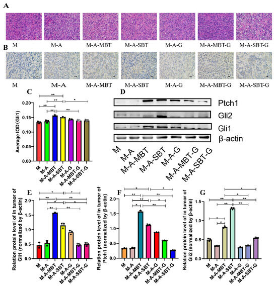 A similar amount of protease inhibitor mixed with RIPA lysis buffer (Solarbio) was added after the tumour tissue was placed in the centrifuge tube. After tissue was homogenised on ice, the supernatant was collected by centrifuging it at 12,000× g for 10 min at 4 °C to determine the protein concentration. Cellular proteins were then separated using 10–12% gel electrophoresis (SDS-PAGE) and transferred to polyvinylidene fluoride (PVDF) membranes, which were then blocked with 5% dry milk-TBST (20 mM Tris-HCl (pH 7.6), 127 mM NaCl, 0.1% Tween 20) at ambient temperature for an hour. Following an overnight incubation at 4 °C with a primary antibody that had been adequately diluted, PVDF was then incubated for 60 min at room temperature with a secondary antibody that had been diluted with 1% dry milk-TBST. The following antibodies were used: rabbit anti- β-actin (β-actin), mouse anti-smoothened homolog (Smo), rabbit anti-sonic hedgehog homolog (Shh), rabbit anti-patched homolog 1 (Ptch1), rabbit anti-glioma associated oncogene 1 (Gli1), and rabbit anti-glioma associated oncogene 2 (Gli2). The information of each specific antibody is shown in Supplementary Table S5 and the uncropped blots are shown in Supplementary Figures S2 and S3. In addition, the uncropped blots and molecular weight markers are shown in Supplementary Figures S4 and S5.