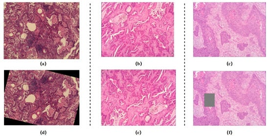 Lung adenocarcinoma data: representative pathological images of (a) microinvasive lung adenocarcinoma, (b) invasive lung adenocarcinoma, and (c) normal lung tissue; data enhancement operations: (d) random sample rotation, (e) random flip, and (f) random region masking. (The initial size of the images are 2048 × 1536 and are resized to 224 × 224).