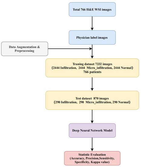 The pathology digital section image data were obtained from 766 cases in 2019–2020 at the First Hospital of Baiqiu’en, Jilin University, and the data were compiled and labeled by four professionals each with more than five years of work experience over a period of three months to ensure that each sample case had significant clinical phenomena. The selected data were then used to producde digital images using a digital pathology scanning instrument and cropped into patch images at 20× magnification, with each section size being 224 × 224. In addition, patches that were blurred or over-stained as well as full-slide backgrounds were screened out through a manual process during the data pre-processing stage. Finally, as shown in Figure 1, the dataset contained a total of 7332 lung cancer pathology sections that could be used in the experiments, of which 2444 were assigned to the Infiltration category, 2444 were diagnosed as Microinfiltration, and the other 2444 belonged to Normal cases. We randomly selected 870 images (290 Infiltration, 290 Microinfiltration, 290 Normal) as the test set and used the results from the test set feedback to continuously optimize the model parameters to ensure that its performance met the clinical criteria. Among the invasive and microinvasive lung adenocarcinomas, the tumors were predominantly of the adnexal type of growth, whereas microinvasive adenocarcinomas had foci of infiltration ≤0.5 cm in maximum diameter and were of the follicular, papillary, micropapillary, or solid type. Infiltrating adenocarcinomas had foci of infiltration with a minimum diameter >0.5 cm. Normal represented a benign area of lung tissue. The detailed production process of this experimental dataset is shown in Figure 2.