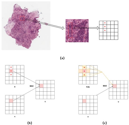 During data analysis, we found that the histological features of lung cancer pathology can be broadly classified into adnexal, alveolar, papillary, micropapillary, and solid types, and the cells that are likely to be presented in the high magnification field of view are mostly tubular, columnar-elliptical, and peg-shaped. Pathologists rely on the information of these complex shape features in order to diagnose the type of cancer and the degree of infiltration. From the visual sensory point of view, the images are very neighborly (adjacent pixels are likely to be the same), which requires the neural network to be more sensitive to spatial information. In general, if the goal is to enhance the model’s ability to spatially model the aforementioned tissue shapes, it is necessary to design more complex convolutional layers to provide the network with this ability, ignoring the consideration of the spatial dimension of the activation layer. As shown in Figure 3a, we first analyzed the approximate location of the pathological feature shapes on the feature map on the lung cancer pathology image; it can be seen that each pixel point in the output feature map represents a block in the original image due to the CNN downsampling operation. Assuming that a single tubular lesion is represented by three scalars (red dots) in the vertical direction on the feature map, as in the figure, the ReLU function behaves as in Figure 3b, where only one scalar can be computed during each activation, each scalar contains only its own part of the information, and it does not have the ability to model the contextual information. To address this problem, we propose a new activation function, CroReLU, as shown in Figure 3c, which utilizes a crossed receptive field for spatial context-based activation of each scalar, replacing the original ReLU function. This unconventional square perceptual field window fully considers the histological shape characteristics of lung cancer. Two 1D convolutions, K∗1 and 1∗K, are utilized to equate to a 2D cross-shaped window for spatial context modeling. In this way, each scalar of the feature map contains information about the shape of pegs, papillae, etc. Regarding the design method of the cross-shaped window, it was proven in [25] that by assuming several size-compatible 2D convolution kernels while keeping the step size constant on the same input, they should have the following characteristics: