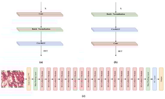 CroReLU as a stand-alone module can easily replace the normal AF. However, it needs to be combined with the convolutional and BN layers, which are the neural network components, for the activation layer to work. According to [26], the components of a neural network are “pre-activation” (BN -> ReLU -> Conv) and “post-activation” (Conv -> BN -> ReLU). For image classification tasks, using “pre-activation” has two advantages: (1) using BN as pre-activation enhances the regularization of the model; and (2) it makes the network easier to optimize. To explore the performance and plug-and-play nature of CroReLU, we summarize two neural network components based on a previous work: Conv-ReLU (“post-activation”) and CroReLU-Conv (“pre-cross-activation”). As shown in the Figure 4a, the network components that constitute Conv-ReLU are Conv -> BN -> ReLU, while the composition of CroReLU-Conv is BN -> CroReLU -> Conv (Figure 4b). In the process of building the neural network model, as shown in Figure 4c, we selected SeNet as the backbone and inserted CroReLU-Conv directly to replace the original network components. Because SeNet can focus on the relationship between channels, it is expected that the model can automatically learn the importance of different channel features. For this purpose, SeNet uses the Squeeze-and-Excitation (SE) module, which aims to model the correlation between different channels; by learning, the network automatically obtains the important features of each channel. Finally, different weight coefficients were assigned to each channel to reinforce the essential features and suppress the unimportant features.