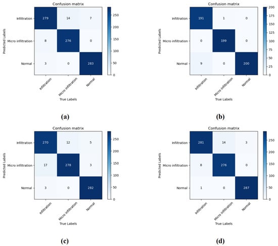 The experimental results can be further addressed by the relevant model confusion matrix shown in Figure 5. As can be seen from Figure 5a,c, the errors in the classification process of SENet50 and MobileNet mainly focus on the confusion between Induction and Micro Infitration, as the samples of both categories of appeal contain tumors and the difference only lies in whether the infiltration area is greater than 5 mm. For certain samples near the critical value, the model provides an incorrect judgment; intuitively, this is consistent with the visual misconception of human observation of features. Conversely, as can be seen in Figure 5b, SENet50_CroReLU effectively mitigates this problem, with only one case of an image being confused between the Infiltration and Microinfiltration categories. As can be seen from Figure 5d, MobileNet_CroReLU is not effective in solving the obfuscation problem, although it has improved performance. We analyze the reasons for this in two ways. First, MobileNet [27] uses deep separable convolution instead of traditional convolution, which sacrifices 1% of the accuracy in return for reducing the computation time by ninefold, suggesting that MobileNet itself aims to sacrifice a small amount of accuracy to lighten the convolutional neural network and facilitate the relevant deployment of the model. Second, the biggest difference between MobileNet and SENet is that SENet is designed with a channel attention mechanism (SE module), and it is the incorporation of the SE module that makes SENet steadily outperform ResNet, MobileNet, and other models in various computer vision tasks. Thus, CroReLU used in combination with the SE module can effectively identify differences in infiltrative and microinfiltrative pathological features.