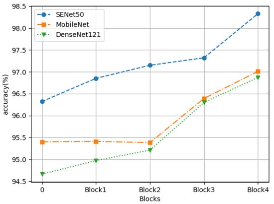 In addition, Figure 6 shows the relationship between the accuracy rate and the percentage of CroReLU contained in the model. In this experiment, three experimental models (SENet50, MobileNet, and ResNet50) were selected; their common feature is that they are all composed of four blocks in the structural design. The horizontal coordinate of 0 represents the accuracy obtained when using ReLU in all blocks of the model. Block1 indicates that CroReLU is applied only in the first block of the model, and the rest use ReLU for visual activation. Block2 represents that CroReLU is used in the first two blocks of the model and ReLU is maintained in the last two blocks. Block3 indicates that only the last block uses ReLU, and Block4 indicates that all AFs in the model use CroReLU. As shown in the figure, when the AFs in the first two blocks are replaced (especially when only Block1 is used), the performance of MobileNet and ResNet50 is not greatly improved, which indicates that the receptive field extracted by the convolution network in the middle and low layers is relatively small and the advantage of activation considering pixel space information is not exploited. By contrast, SENet has the advantage of channel attention mechanism, and shows a certain upward trend in accuracy in the early stage. After Block2, the accuracy of MobileNet and ResNet50 is significantly improved, which proves that CroReLU needs feature maps containing sufficient semantic information to perform at a high level. The channel attention mechanism needs to be fully paired with CroReLU to show the best results in pathology diagnosis. In summary, all visual activation methods need to be replaced with CroReLU to take advantage of neural networks in cancer pathology diagnosis.