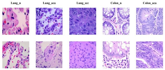 To ensure that SENet50_CroReLU is not sensitive only to the degree of lung cancer infiltration, we validated the generalization ability of the proposed method on the LC25000 dataset [28], which contains pathology images of both lung and colon cancer divided into five major categories: conventional lung cell digital pathology images (Lung_n), lung adenocarcinoma digital pathology images (Lung_aca), lung squamous adenocarcinoma digital pathology images (Lung_scc), colon adenocarcinoma digital pathology images (Colon_n), and normal colon cell digital pathology images (Colon_aca). As can be seen from the Table 3, the number of data samples for each disease category is as high as 5000, and the total number of samples in the dataset is 25,000, which supports the reliability of the experimental results. As with the private lung cancer dataset, each of these categories was divided into a training set (4500) and a test set (500). Examples of samples from each class of the LC25000 are shown in Figure 7.