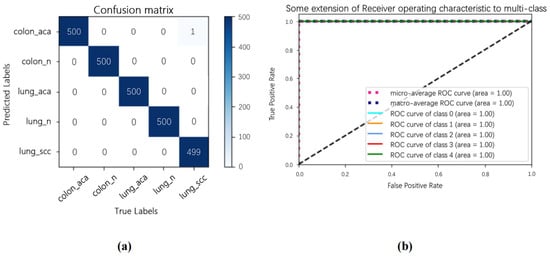 SENet50 _CroReLU classification results on LC25000 data showing (a) confusion matrix and (b) ROC curves.