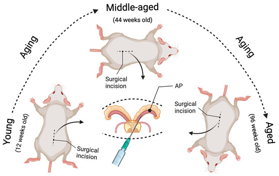 Illustration of the novel strategy to model age-related prostate cancer. The prostate-specific Pten knockout prostate cancer mouse model can be induced at different ages (young, middle-aged, and aged) by intraductal delivery of an adenovirus expressing Cre-recombinase to the prostate anterior lobes (AP) of Pten floxed mice. The surgical incision was performed at 12 weeks of age for the young group, 44 weeks for the middle-aged group, and 96 weeks for the aged group. As a result, the tumor growth can be compared in the same time interval post-Pten excision between the aged and non-aged mice (e.g., 4, 8, and 16 weeks post-delivery of the Cre-expressing adenovirus), leading to a better understanding of the effects of aging on prostate carcinogenesis.
