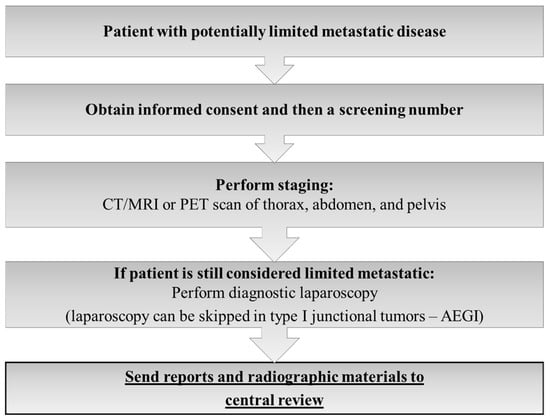 In contrast to other trials in the limited metastatic situation, the German RENAISSANCE/FLOT-5 trial [] is based on three major aspects that, based on the data obtained in the FLOT-3 trial, are considered fundamental to the evaluation of the role of curative intended surgery in limited metastatic gastric cancer: (1) a good selection of gastric cancer patients who may still benefit from a curative intended treatment, even if they are already formally in a stage IV disease; (2) the selection includes patients’ factors, e.g., ECOG status and tumor-related factors including localization and extent of the oligometastatic situation; (3) the need for an effective chemotherapeutic regimen in the “neoadjuvant” situation to maximize response and in the “adjuvant” situation to stabilize surgical results. In addition, the molecular basis of the tumors, e.g., HER2 or PD L1 status, is also considered. It is important to clearly define that the aim of surgical procedure in modern trials is curatively intended in the oligometastatic setting, as FLOT-5 currently is []. Furthermore, induction with the most effective regimen, respecting the aggressive nature of esophagogastric adenocarcinomas, is important. Administration of only a delayed-effective systemic therapy after a local procedure would deny the fact that the limited metastatic situation is already a stage IV disease.