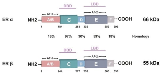 - Enmark, E.; Pelto-Huikko, M.; Grandien, K.; Lagercrantz, S.; Lagercrantz, J.; Fried, G.; Nordenskjöld, M.; Gustafsson, J.A. Human estrogen receptor β-gene structure, chromosomal localization, and expression pattern. J. Clin. Endocrinol. Metab. 1997, 82, 4258–4265. [Google Scholar] [CrossRef] [PubMed]
