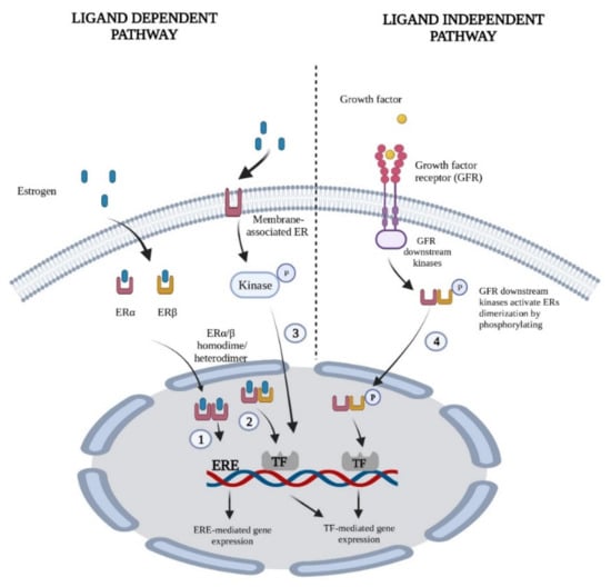 - Yaşar, P.; Ayaz, G.; User, S.D.; Güpür, G.; Muyan, M. Molecular mechanism of estrogen-estrogen receptor signaling. Reprod. Med. Biol. 2016, 16, 4–20. [Google Scholar] [CrossRef]