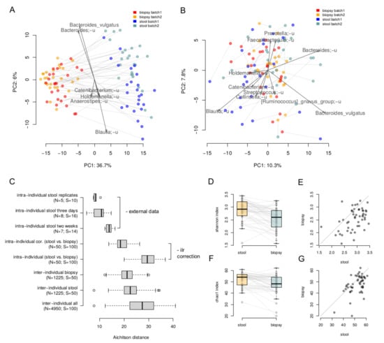 Comparison of paired luminal and tumor-associated microbiomes. (A,B)—The stool and biopsy compositions are visualized using PCoA (Principal Coordinates Analysis) based on the Aitchison distance. Arrows show the top taxa in terms of the explained variance in given axes. An arrow length is proportional to the percent of variance explained by the taxon. An arrow angle reflects the distribution of this variance between the axes ((A)—before the correction; (B)—after correction in the ilr coordinates). (C)—Intra and inter-individual variation between samples. Variation between stool samples from the same person obtained from the same sample (“intra-individual stool replicates”), with 3 days (“intra-individual stool three days”) and 2 weeks (“intra-individual stool two weeks”) gap was estimated using the previously published data [34]. Variation between stool and biopsy samples of one patient was calculated before (“intra-individual”) and after (“intra-individual cor.”) the correction. The number of distances computed in each group as well as number of samples are given in brackets. (D,E)—Comparison of alpha diversity of the stool and biopsy samples (Shannon metric). (F,G)—Comparison of alpha diversity of the stool and biopsy samples (Chao1 metric).