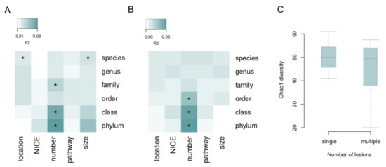 The associations of microbiome composition in general with each lesion characteristic (i.e., via permutational analysis of beta diversity, see Methods) were investigated with the correction for the batch and Shannon index (Figure 2). Significant links with species-level microbiome composition were observed for the lesion size and location for the biopsies (PERMANOVA, FDR = 0.09 and FDR = 0.02, R2 = 3% and R2 = 5%, respectively). The number of lesions was linked to microbiome: for biopsy samples—on the phylum, class and family levels (FDR < 0.02, R2 > 5%); and for the stool—on the phylum, class and order levels (FDR < 0.07, R2 > 4%). The number of lesions was negatively correlated with chao1 diversity index in biopsy samples (mixed effect model, FDR = 0.0495, Figure 2).