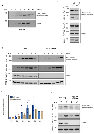 Aurora-A MARylation is dependent on PARP10 during the G2/M transition. MARylation levels of Aurora A were analyzed using the Af1521 macro domain-based pull-down assay on total cell lysates obtained from: (a) HeLa cells harvested at different time points (as indicated) after double thymidine block; (b) synchronized HeLa cells harvested at 8 h after release untreated (control) or treated with the PARP10 inhibitor OUL35 (10 µM, 2 h); (c) wild-type and PARP10 KO HeLa cells harvested at different time points (as indicated) after double thymidine block; (d) Quantification of MARylated Aurora-A from c. Data are means (±S.D.) from three independent experiments. Two-tailed Student’s t-tests were applied to the data (* p < 0.05). (e) Total lysates from synchronized HeLa cells treated (48 h) with non-targeting siRNA (non-targ.) or a pool of PARP10 siRNAs (PARP10 siRNAs), were harvested at 8 h after release and analyzed for Aurora-A ADP-ribosylation by Af1521 macro domain-based pull-down assay. Full pictures of the Western blots are presented in Figure S6.