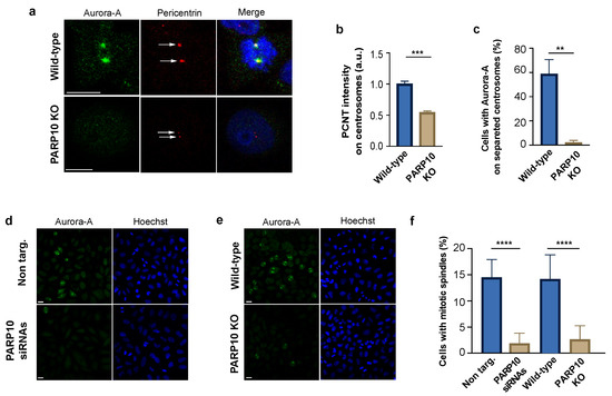 Using indirect immunofluorescence, we analyzed the centrosome maturation checking the localization of Aurora-A and the amount of centrosomal protein pericentrin (PCNT), a protein that participates in the establishment of a centrosomal matrix that is important for the recruitment and activation of mitotic kinases. The synchronized wild-type and PARP10 KO cells were fixed 10 h after the thymidine washout, labelled with corresponding antibodies and examined by confocal microscopy. Importantly, in PARP10 KO cells, we observed a strongly reduced staining of PCNT on centrosomal structures (Figure 4a,b) and a decrement in the percentage of centrosomes that were positive for Aurora-A (Figure 4a,c), likely due to the observed delay in Aurora-A MARylation (Figure 2c,d) and the following recruitment on centrosomes. Nevertheless, the duplication and separation of the centrosomes were evident, although less pronounced in cells lacking PARP10. This behavior excludes a detrimental effect of the PARP10 depletion on G2 entry (Figure 4a, arrows) [63].