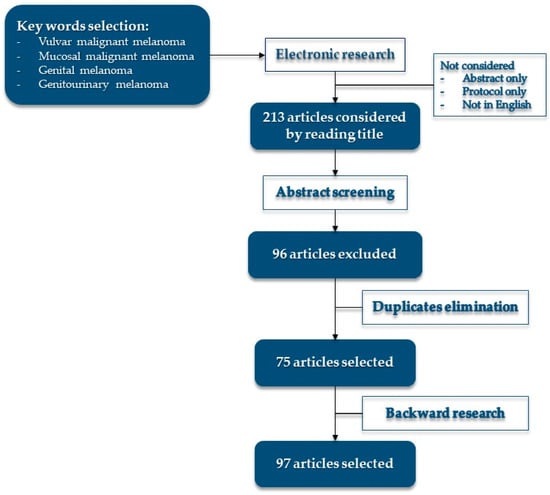 Literature research was conducted on PubMed, Web of Science, MEDLINE, Google Scholar, and Cochrane, until June 2022, using keywords: “vulvar malignant melanoma”, “mucosal malignant melanoma”, “genital melanoma”, and “genitourinary melanoma”. Four authors conducted the research independently, duplicates were eliminated, and articles were collegially discussed. Backward literature research was conducted on selected articles. See Figure 1 for more details on research.
