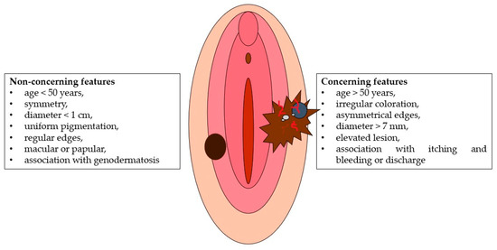 Groin node enlargement or urethral meatus obstruction associated with a pigmented vulvar lesion should also be referred to a specialist. “ABCDE” criteria [63] can be useful in the clinical evaluation of a suspected pigmented lesion: asymmetry, border irregularity, color, diameter, and evolution (of size, shape, or color) should be evaluated [61,64]. The amelanotic type lacks the typical dark color and could be confused with vulvar carcinoma [65,66]: it accounts for 2–10% of all VMs [30,66], is more common in postmenopausal women [65], and often appears “reddish” [58]. Clinical examination of the lesion can distinguish concerning and non-concerning features (as shown in Figure 3). The association between dermoscopy and confocal reflection can help clinicians make a correct diagnosis [8]. The presence of globular cobblestone, with an annular or reticular pattern, is a reassuring dermoscopic characteristic of a lesion, compared to the gray color, with possible blue points and atypical vascularization. Likewise, the increase in atypical cells with disturbed architecture is a concerning microscopic feature, while scattered or hyper-refractive dendritic cells around the papillae are of no concern.