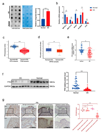 The mRNA expression profiles of FTO in normal ovarian tissue and EOC tissues were obtained using the HTseq-FPKM from the GTEx (https://xenabrowser.net/datapages/, accessed on 4 December 2020) and TCGA (https://portal.gdc.cancer.gov/, accessed on 4 December 2020) databases and further transformed by log2 (FPKM + 1) for gene expression level analysis. Proteomic data of FTO from the CPTAC database were visualised using the UALCAN website (http://ualcan.path.uab.edu/, accessed on 25 May 2021).
