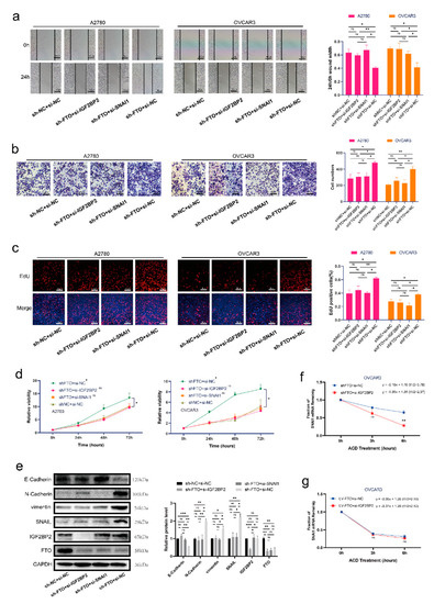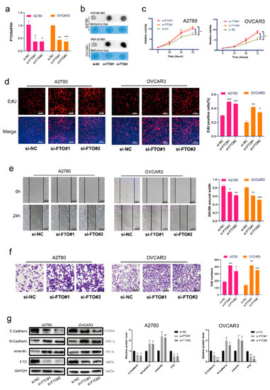 We first verified the FTO knockdown efficiency of siRNA in the A2780 and OVCAR3 cell lines (Figure 2a). Next, we used m6A dot blot assays to demonstrate that m6A levels were increased in the FTO knockdown group (Figure 2b). Cell proliferation and viability were also shown to increase after FTO knockdown (Figure 2c,d) via EdU and CCK-8 assays, respectively. The wound healing assay revealed that FTO knockdown upregulated the migration of EOC cells (Figure 2e). Transwell assays showed that FTO knockdown promoted EOC cell invasion (Figure 2f). In addition, we found decreased expression of E-cadherin and increased expression of N-cadherin and vimentin after FTO knockdown (Figure 2g).