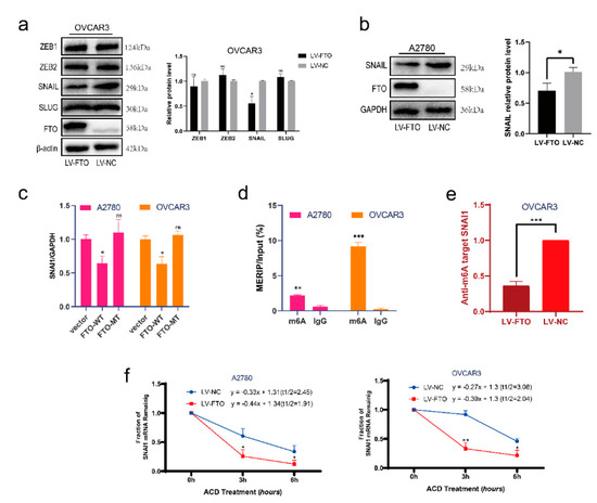 FTO decreases the stability and expression of SNAI1 mRNA. (a) Expression of EMT-related transcription factors, ZEB1, ZEB2, SNAIL and SLUG in OVCAR3 cells was determined by Western blot. (b) Expression of SNAIL in A2780 cells with indicated treatments detected by Western blot. (c) The expression of SNAI1 mRNA in FTO-WT overexpression, FTO-MT overexpression, and control vector transduced A2780 and OVCAR3 cells was examined by RT-qPCR. (d) MeRIP assay detected the m6A-modification on SNAI1 mRNA in A2780 and OVCAR3 cells. (e) The m6A level of SNAI1 mRNA in LV-FTO or LV-NC OVCAR3 cells was detected by MeRIP. (f) After treatment of cells with 10 μg/mL of ACD for 0, 3, and 6 h, SNAI1 mRNA level in LV-FTO or LV-NC cells was detected by RT-qPCR. Data are presented as mean ± SD; ns, not significant; * p < 0.05; ** p < 0.01; *** p < 0.001. The uncropped blots are shown in Supplementary Materials File S1.