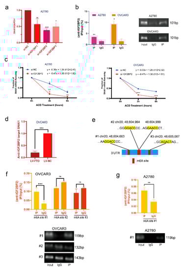 To further verify the mechanism of interaction between IGF2BP2 and SNAI1 mRNA, we investigated m6A sites on human SNAI1 mRNA that may be combined with IGF2BP2 on the RMBase website (http://rna.sysu.edu.cn/rmbase/, accessed on 13 July 2021). All m6A sites are located in the SNAI1 mRNA 3’ UTR region (Figure 5e). The RIP assay showed that IGF2BP2 mainly binds to m6A site 1 (chr20; 48,604,663) in the EOC cell line OVCAR3 (Figure 5f). The RIP experiment in A2780 cells also proved that IGF2BP2 was bound to m6A site 1 (Figure 5g).