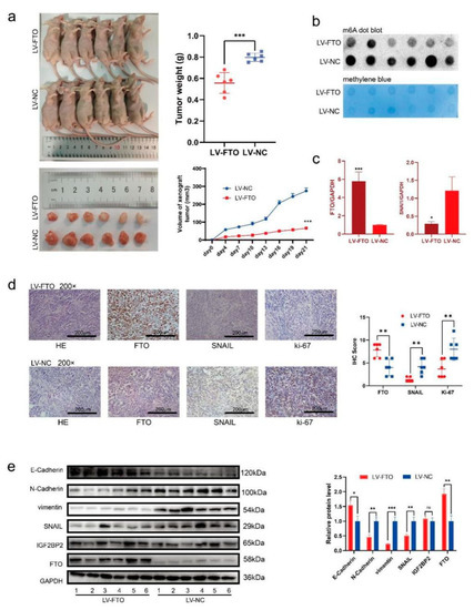 To study the effect of FTO on the proliferation of EOC in vivo, we injected FTO stably overexpressed (LV-FTO) and negative control (LV-NC) OVCAR3 cell lines subcutaneously into nude mice. We observed slower tumour growth, decreased tumour volume, and reduced tumour weight in the LV-FTO group (Figure 7a). The m6A levels in subcutaneous xenograft tumours in the LV-FTO group decreased (Figure 7b), and the mRNA expression of SNAI1 was downregulated (Figure 7c). IHC showed decreased expression of SNAIL and Ki-67 in the LV-FTO group (Figure 7d). Furthermore, the expression of N-cadherin and vimentin decreased in the LV-FTO tumours. In contrast, E-cadherin expression was increased in the LV-FTO tumours (Figure 7e). The expression of IGF2BP2 did not change with FTO level (Figure 7e). Therefore, our results suggest that FTO can reduce the methylation level of m6A in EOC, inhibit SNAIL expression, and inhibit EMT in vivo.