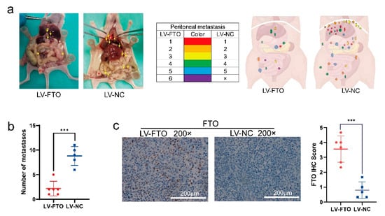 Next, we constructed a model of abdominal metastasis of ovarian cancer. On the 25th day of modelling, one mouse in the LV-NC group died; therefore, we immediately terminated the experiment. After the euthanasia of surviving mice, we observed more intraperitoneal metastases in the LV-NC group than in the LV-FTO group, and the tumour distribution was more extensive (Figure 8a,b). The results of IHC proved that the expression of FTO in the LV-FTO group was significantly higher than that in the LV-NC group (Figure 8c). Together, these results indicated that FTO can weaken the growth and metastasis of EOC in vivo.