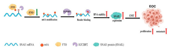 We demonstrated that FTO was expressed at low levels in EOC. The downregulation of FTO promoted EOC progression by accelerating the expression of SNAI1. Mechanistically, downregulation of FTO increases the m6A modification of SNAI1 mRNA and enhances the recognition and binding of IGF2BP2 to SNAI1 mRNA in an m6A-dependent manner, resulting in mRNA stabilisation and upregulation of SNAI1, promoting EMT, and the growth and metastasis of EOC cells (Figure 9).
