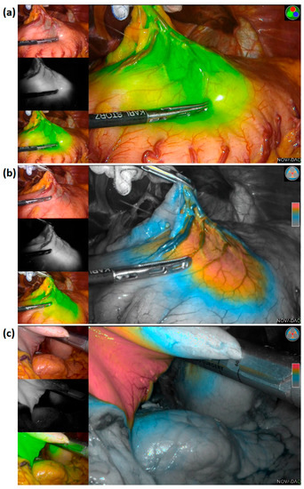 (a) ICG diffusion range on a gastric wall, pinpoint mode: fluorescence signal in green overlayed on the white light image-helpful to check the fluorescence image in real-time during surgery; (b) ICG diffusion range on a gastric wall, colorized mode: fluorescence with color gradient by signal intensity overlayed on the gray-scale white light image-helpful to check the difference in fluorescence signal intensity; (c) resection of the stomach with secured proximal resection margin performed by including the entire portion of ICG diffusion range in the resected specimen.