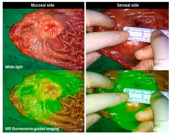 ICG has also been used as an alternative to other tattooing dyes [33,34]. Although an endoscopic procedure is required before surgery, ICG injection does not require additional time and equipment during surgery, unlike other tumor localization methods. Recently, ICG injection has been used for fluorescence lymphography, not for tumor localization, to visualize draining lymphatics and lymph nodes under NIR imaging during minimally invasive gastrectomy. NIR fluorescence lymphography-guided gastrectomy has shown beneficial effects in identifying and retrieving draining lymph nodes from the tumor and in the consequential complete dissection of the lymph nodes [14,19,24,25]. In addition, without any procedures, NIR fluorescence-guided gastrectomy has the potential to provide tumor localization and secure a sufficient resection margin. Since the ICG diffusion area during fluorescence lymphography-guided gastrectomy is not detectable in the visible spectrum and only visible on NIR imaging, ICG diffusion does not obscure the surgical field and does not interfere with surgery. Selective and repeated images or an image overlay of NIR fluorescence help visualize the ICG diffusion area in real time during surgery, and this overcomes the disadvantage of one-time tumor localization of other localization methods. Furthermore, ICG injection for NIR fluorescence-guided surgery could provide sufficient information to secure the resection margin in gastric cancer surgery in patients with EGC.