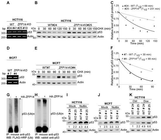 ZFP14 regulates p53 protein stability through MDM2. (A,D) The levels of p53 and actin mRNAs were measured in isogenic controls and ZFP14-KO HCT116 (clones #25 and #10) cells (A) or isogenic control and ZFP14-KO MCF7 (clone #4) cells (D). (B,E) The levels of p53, vinculin and actin proteins were measured in isogenic control and ZFP14-KO HCT116 (clone# 25) cells (B) or isogenic control and ZFP14-KO MCF7 (clone #4) cells (E) mock-treated or treated with cycloheximide (CHX) for indicated times. (C,F) The relative level of p53 protein in (B,E) was normalized to actin and the half-life of p53 protein was calculated by plotting the remaining protein over time. (G,H) pcDNA3-p53 and pcDNA3-2×-Flag-ubiquitin with or without pcDNA3-HA-ZFP14 were transfected in HCT116 cells followed by treatment with 20 µM MG132 for 5 h. Poly-ubiquitinated p53 levels in whole-cell lysates were measured by immunoprecipitation with mouse anti-p53 antibody followed by Western blotting with FLAG-HRP (G) or rabbit anti-p53 (H). (I,J) The levels of p53 and actin proteins were measured in isogenic control and ZFP14-KO HCT116 (clone# 25) cells (I) or isogenic control and ZFP14-KO MCF7 (clone #4) cells (J) mock-treated or treated with Nutlin for 16 h. (K) The levels of p53 and actin proteins were measured in isogenic control and ZFP14-KO HCT116 (clone# 25) cells mock-treated or treated with 250 µg/mL Dox for 18 h.