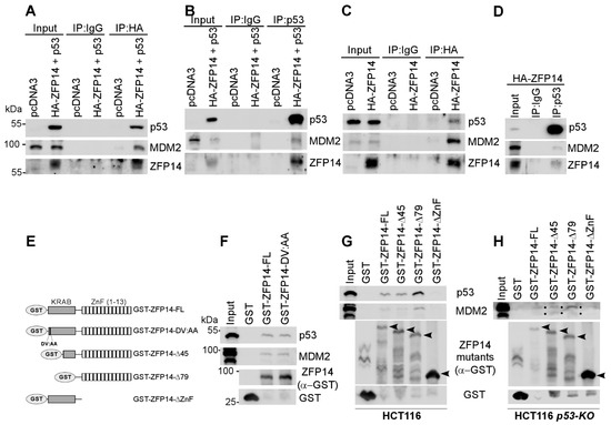 The N-terminal KRAB domain in KRAB-ZNFs is known to be necessary for their association with MDM2 [24]. Specifically, a conserved aspartate and valine in the KRAB domain has been shown to be essential for the association of the KRAB domain with the KAP1-MDM2 complex [6]. Thus, to test if ZFP14 associates with MDM2 through interacting with KAP1 via the KRAB domain, we mutated the aspartate and valine residues in position 10 and 11 of human ZFP14 to alanine residues (DV:AA mutant) (Figure 4E; also see Supplementary Figure S1A). Next, we performed GST pull-down assays with GST-tagged full-length ZFP14 and the ZFP14 DV:AA mutant using lysates from HCT116 cells. Surprisingly, we found that, like the full-length ZFP14, the DV:AA mutant of ZFP14 was still able to associate with MDM2 and p53 (Figure 4F), indicating that ZFP14 might associate with the MDM2-p53 complex independent of its KRAB domain. To test this theory, we generated various GST-tagged truncated mutants of ZFP14 (Figure 4E). GST pull-down assays using HCT116 cell lysates showed that full-length ZFP14 and ZFP14Δ45, as well as ZFP14-Δ79, were all able to associate with MDM2 and p53 (Figure 4G), consistent with the above findings. Notably, the ZFP14-ΔZnF mutant lacking all of the zinc fingers was defective in bringing down both MDM2 and p53 (Figure 4G), suggesting that, unlike other KRAB-zinc finger proteins, ZFP14 associates with MDM2/p53 via its zinc fingers and possibly enhances MDM2/p53 complex integrity. Further, to examine if ZFP14 can bind to MDM2 independent of p53, we performed GST pull-down assays using HCT116-p53-KO cell lysates and showed that the full-length ZFP14 and ZFP14Δ45, as well as ZFP14-Δ79, were all able to bring down MDM2 independent of p53 (Figure 4H).